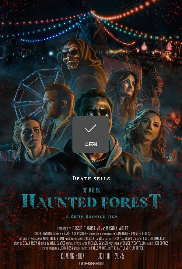 核心背景:2025年美国出品的恐怖片,由 Keith Boynton 自编自导,以万圣节鬼屋森林为故事舞台,围绕少年的第一份工作展开恐怖叙事,亮相 FrightFest London。